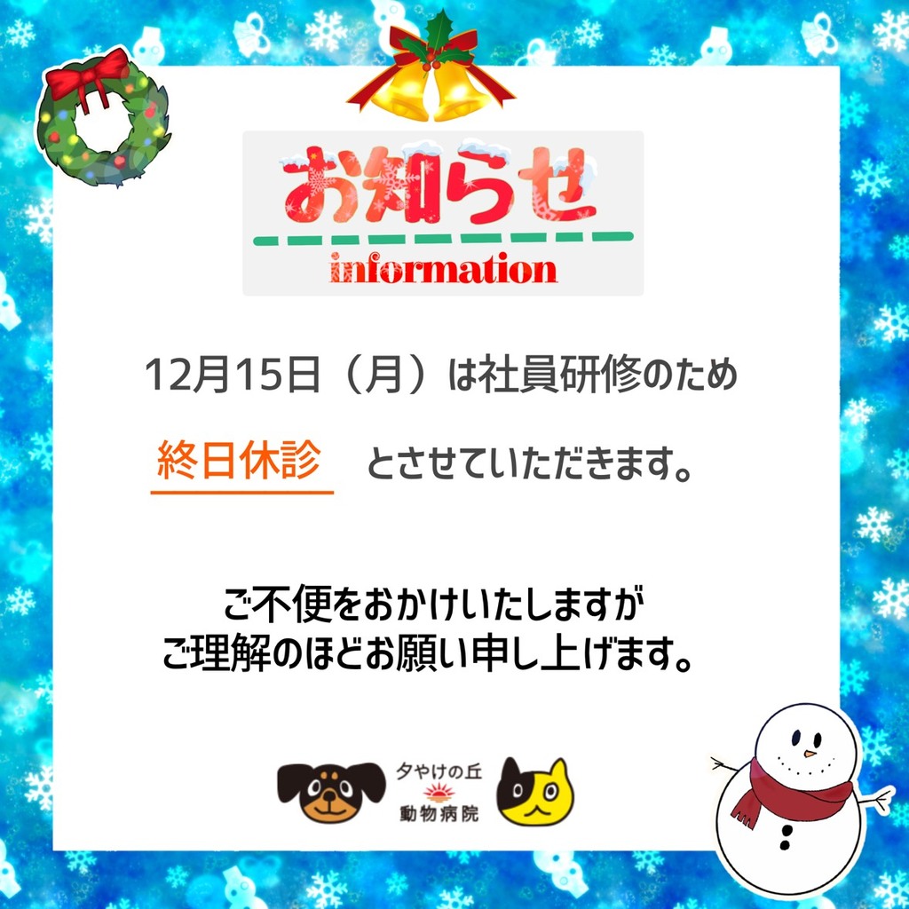 12月15日(月)は社員研修のため、終日休診とさせていただきます。